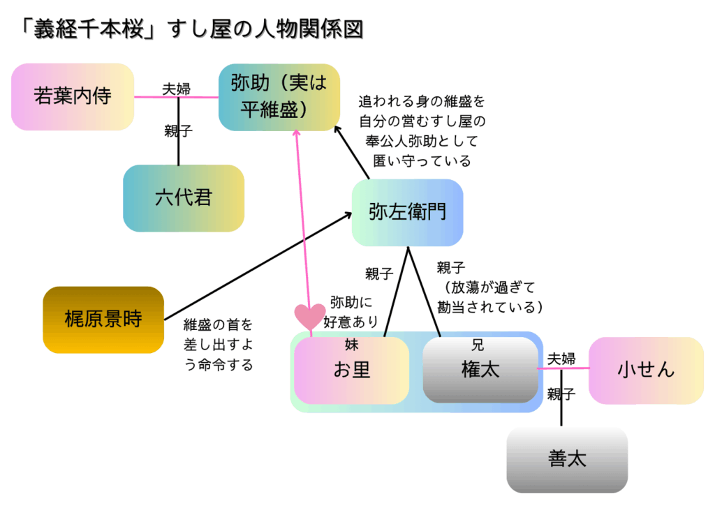すし屋を営む弥左衛門やざえもん平維盛たいらのこれもりを奉公人の弥助ということにして匿っています。弥左衛門は平重盛から恩義を受けているため、維盛を守ろうとしているのです。息子の権太ごんたは度が過ぎる放蕩のため勘当してしまいました。権太の妹お里は弥助に好意があり、弥左衛門としても娘と維盛が夫婦になる方が目立たないため二人の結婚を勧めています。