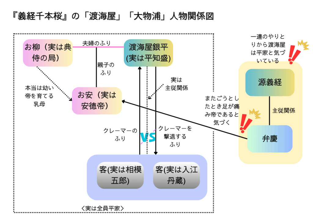 ・義経千本桜の「渡海屋」「大物浦」は平家の残党が義経への報復をねらう物語であり平家が庶民のふりをしている「渡海屋」では世話物、平家として義経を討とうとする「大物浦」では時代物が味わえる演目である。