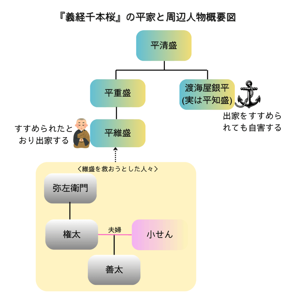 義経千本桜で登場する平家の人間として代表的なのは平知盛と平維盛です。知盛は碇を用いた壮絶な最期を迎えることは先述の通りですが、知盛からみて甥にあたる維盛は出家という道を選びます。維盛は「すし屋」に登場する平家の貴公子で、すし屋を営む弥左衛門、その息子権太とその妻子の命がけの献身によって命が救われていきます。知盛も維盛も源氏から出家を勧められ「命までは奪わない」というメッセージを受け取りますが、出家を拒む知盛と受け入れる維盛と様々です。
